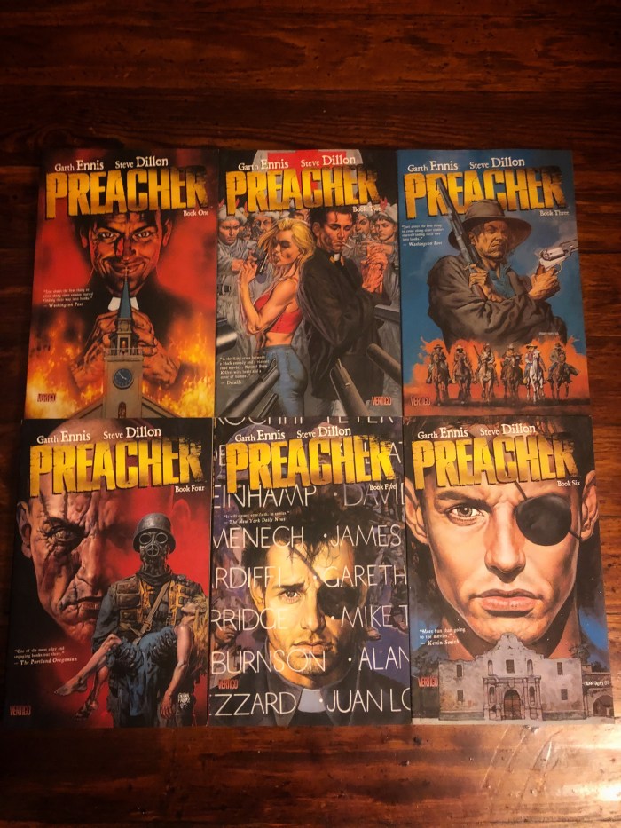 Preacher, over the course of 66 issues bound into six trade paperbacks, skewers all these institutions through the adventures of its characters. Preacher tells the story of small-town Texas preacher Jesse Custer who is possessed by a spirit that has the potential to rival that of God. Tough not a traditional superhero, Jesse has the fighting skills of any hard drinking action hero and the unique entity inside him allows him to speak with the “Voice of God” which allows him to force anyone he meets to do literally whatever he says, be it counting all the grains of sand on a beach or literally dying there on the spot. Using this power, and the help of his gun-toting girlfriend Tulip and an Irish vampire named Cassidy, Jesse embarks on a nation-spanning mission to kill God, a figure he deems responsible for the injustice in the world by creating it and not helping to fix it.