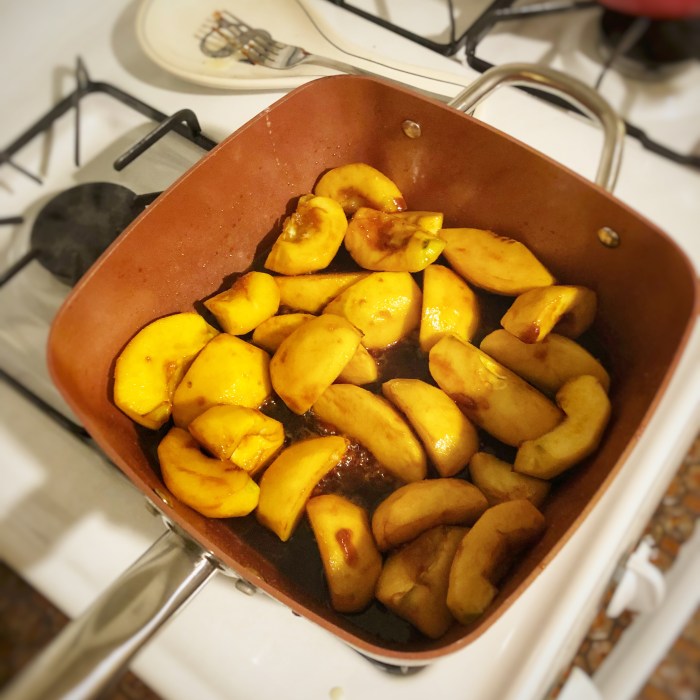 - Add the apples, stirring until they are coated in a thick layer of caramel, and then add vanilla extract.