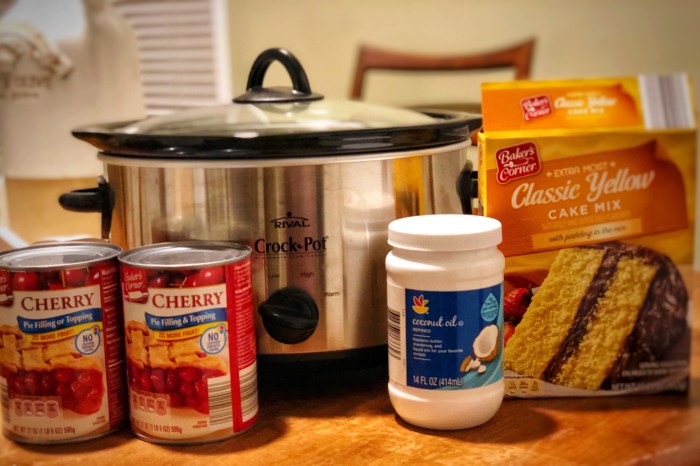 - Add the cherry pie filling, cake mix, and coconut oil to your slow cooker.