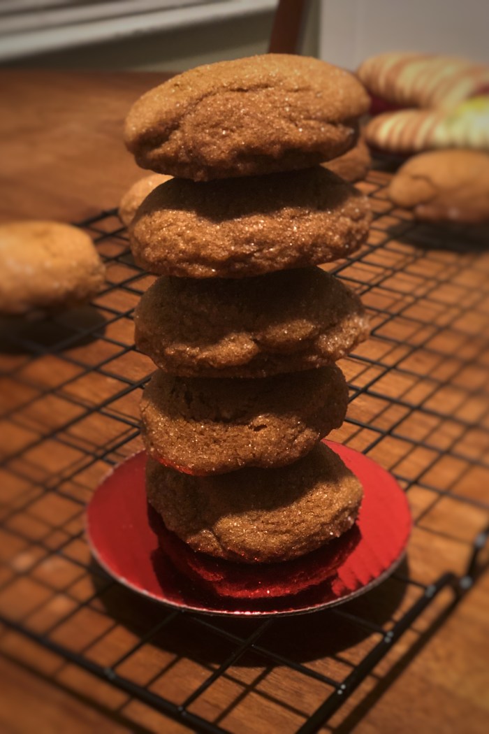 We took out one red circular base and started stacking our molasses cookies. We realized that after 5 cookies, our lovely stack would always collapse. So we needed to come up with another creative way to pack nine cookies.