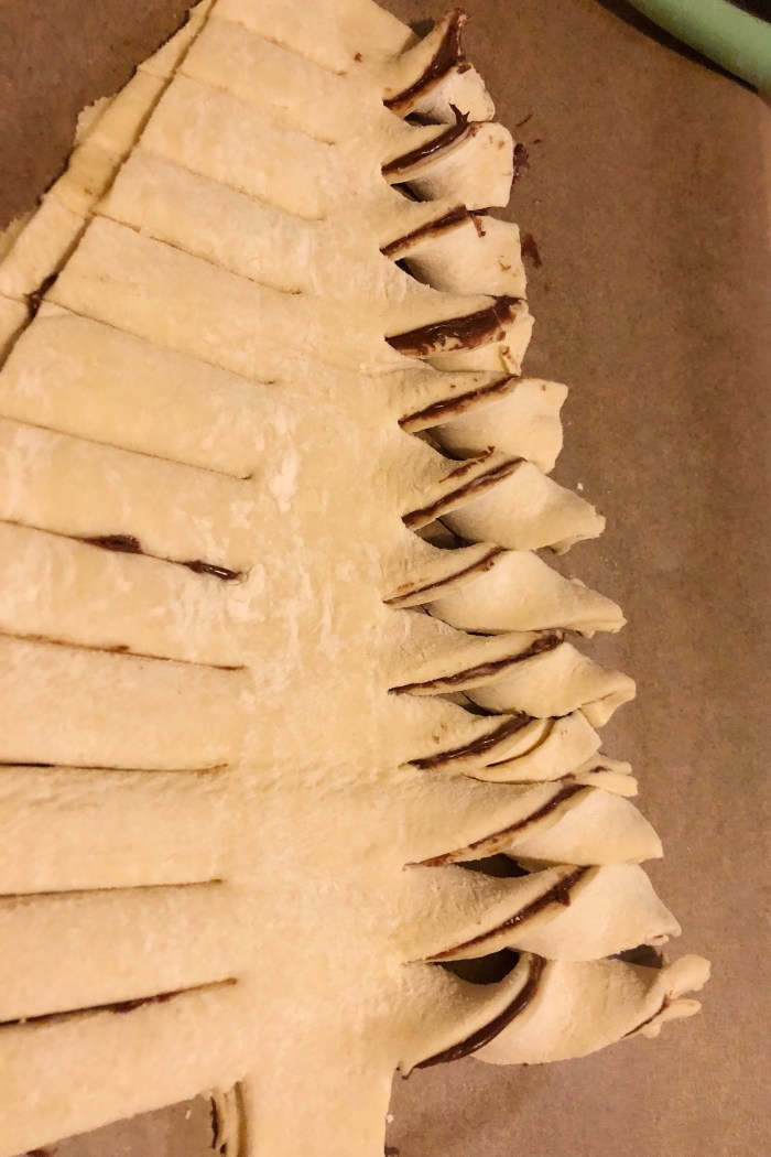 Here we cut two puff pasty sheets into a triangle, which serves as the outline of our yummy tree. Next, we picked one puffy pastry sheet and spread a generous amount of Nutella on top (note: I know it is tempting to eat all of that Nutella, but be patient, the best is yet to come). Next we place the other puff sheet on top and start making cuts on the side AKA the churro tree branches.