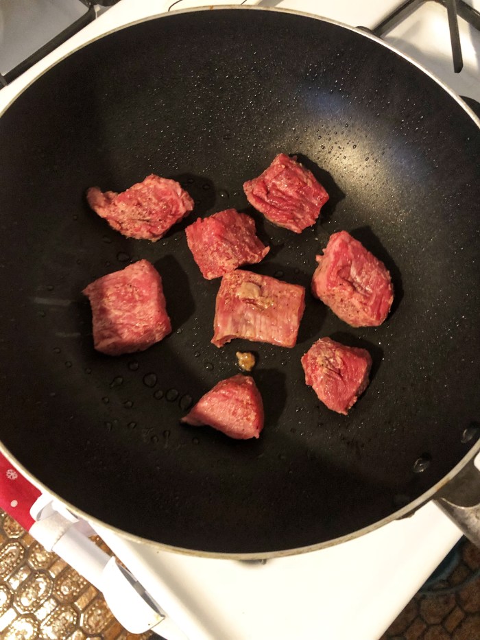 - Place seasoned chuck roast cubes into the remaining oil, butter, and bacon fat. Make sure not to overcrowd your beef. Cook until a nice golden brown on all sides and set aside on a plate covered with a paper towel.